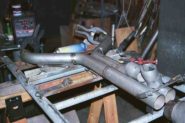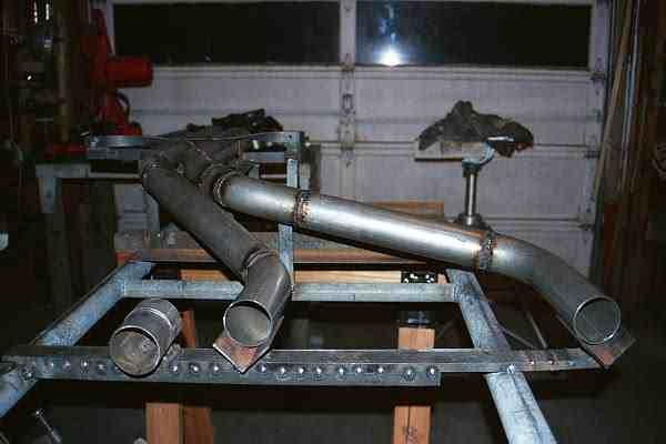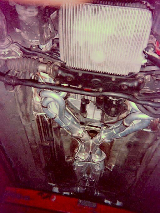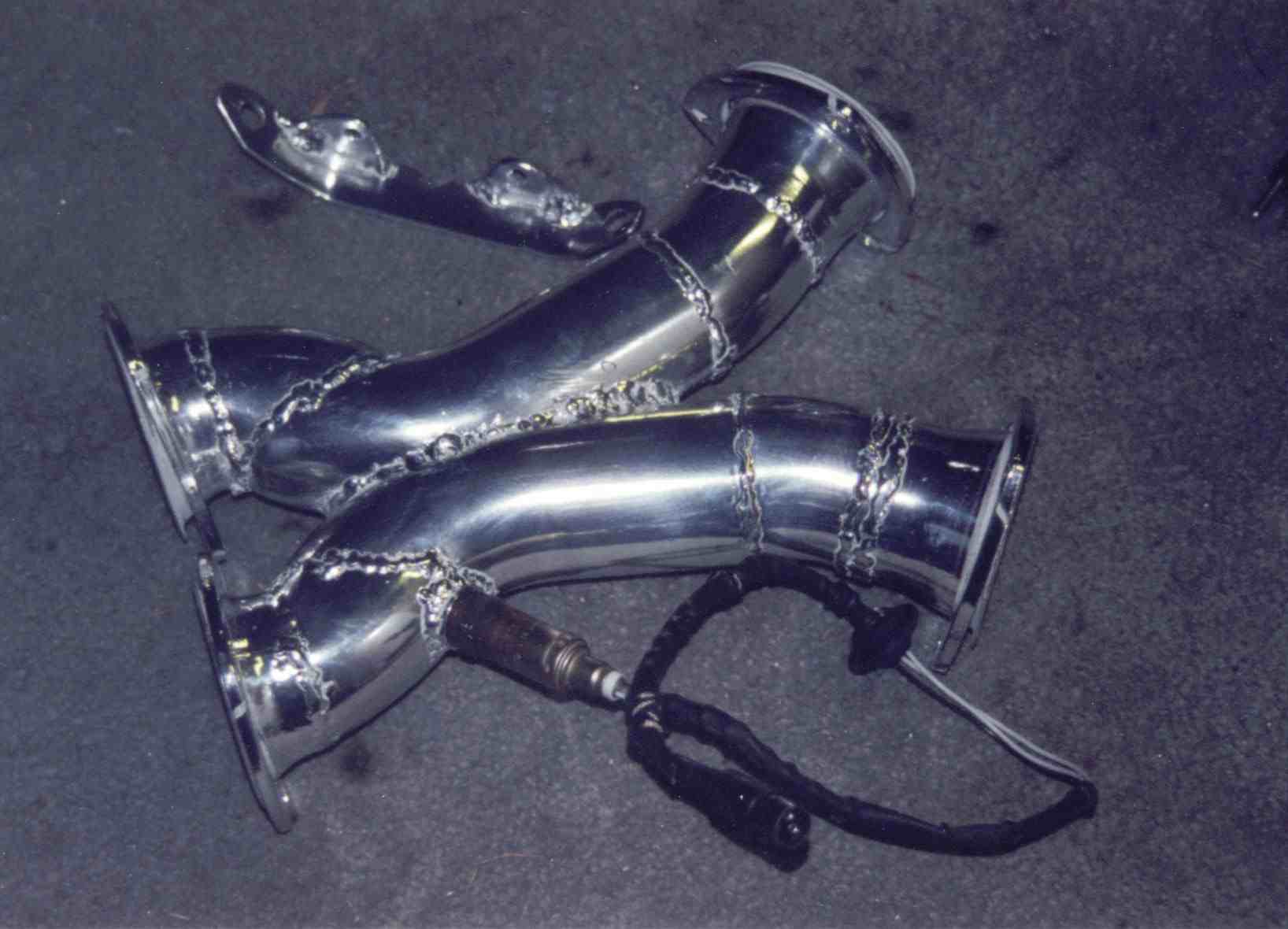 | These are the rear, middle and front (crossover) sections of Louie's exhaust design. The mufflers fit between the rear and middle sections and the CATs fit between the middle and front sections. The front section is the Ott X crossover where the real design magic lives, the other sections are just neccessary plumbing to get the gasses out from under the car. The front section in this case looks more like the MD(Martian Derriere). This was a tight fit because the headers and CATs combine to leave very little room for plumbing especially when trying to get the flow paths to blend at the desired shallow angle. Louie's work results in a set of dimentions for cross section, common flow path length and angle of entrance and exit that seem to create some healthy gains in output. The crossover and header support bracket in the right hand photo are ceramic coated to match the headers and help keep as much heat as possible in the exhaust gasses and out of the engine and other items under the hood. | ||